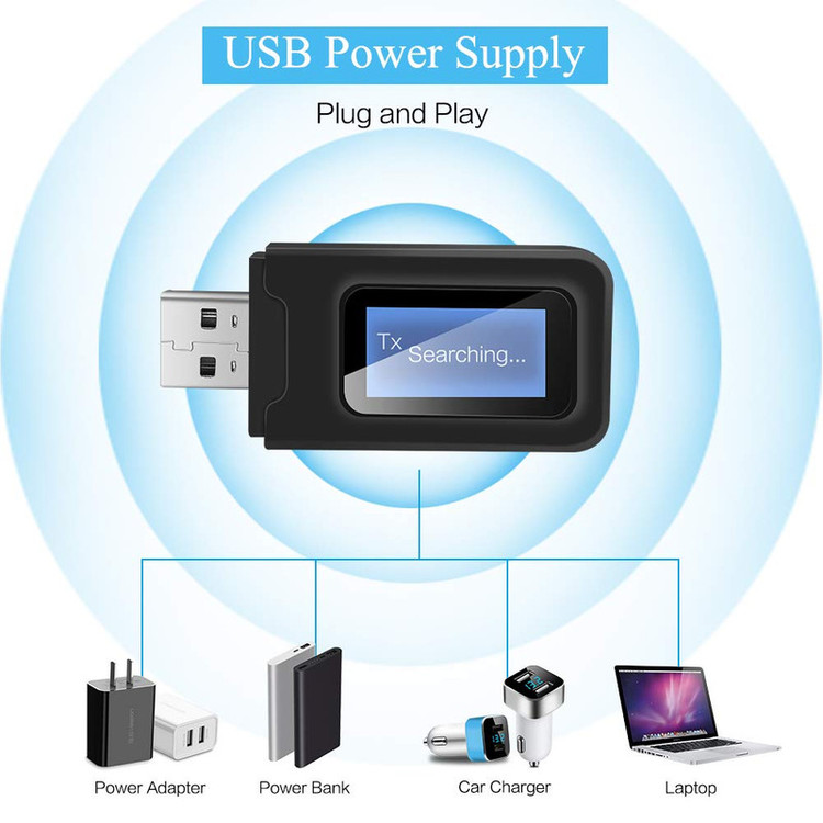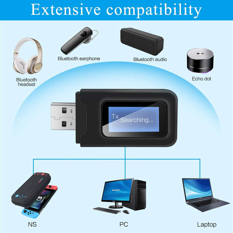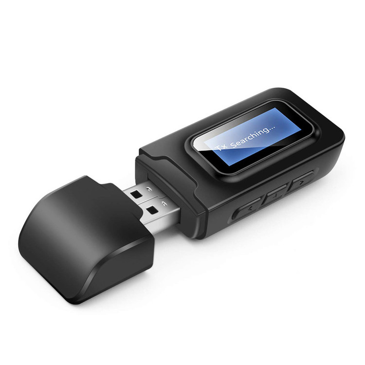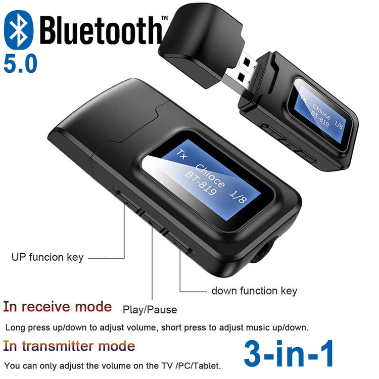 یک دستگاه فرستنده و گیرنده بلوتوثی صدا میباشد که مجهز به بلوتوث نسخه 5.0 میباشد و مناسب افرادی که قصد تماشای تلوزیون بدون مزاحمت برای سایر اعضای خانواده و همچنین برای تبدیل کردن اسپیکر و پخش خودرو ساده به بلوتوث دار مورد استفاده قرار میگیرد . در نظر داشته باشید قبل از تهیه این کالا برای تلوزیون از داشتن جک صدای 3.5 میلیمتری (جک هدفن ) یا خروجی صدای AV یا AUX در تلوزیون خود اطمینان حاصل فرمایید . در ضمن این دستگاه به تمامی گیرنده های دیجیتال ( ست تاپ باکس و ریسیور ) متصل میشود . این دانگل بلوتوثی به یک ال سی دی کوچک مجهز شده و امکاناتی از قبیل نمایش نام دستگاه متصل شده ، امکان انتخاب میان دستگاههای متصل شده ، افزایش و کاهش ولوم صدا به آن اضافه شده است، همچنین در این نسخه هنگام اتصال به کامپیوتر و لپ تاپ و فرستادن صدا ، نیازی به اتصال کابل AUX نمیباشد ، در حالت فرستنده صدا نماد TX و در حالت گیرنده صدا نماد RX روی صفحه نمایش دستگاه نشان داده میشود . برد مفید حدود 10 متر و کیفیت انتقال صدا HD میباشد.