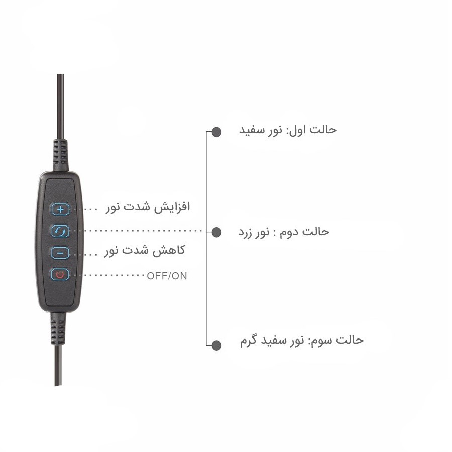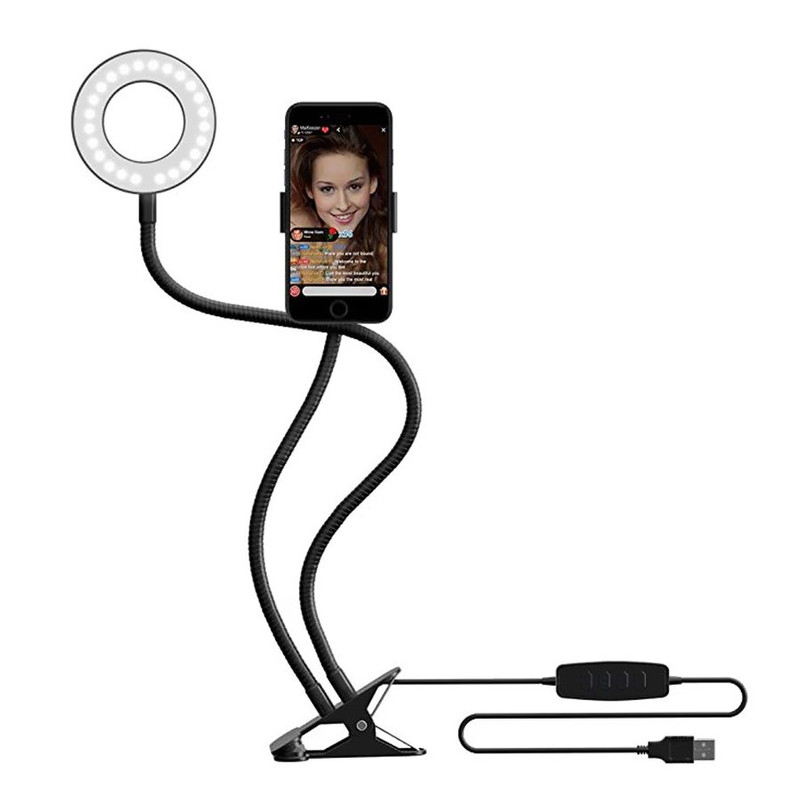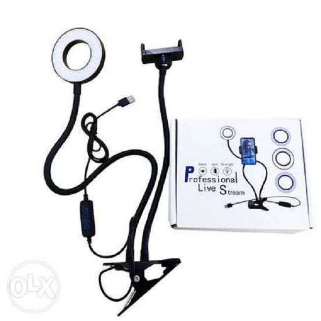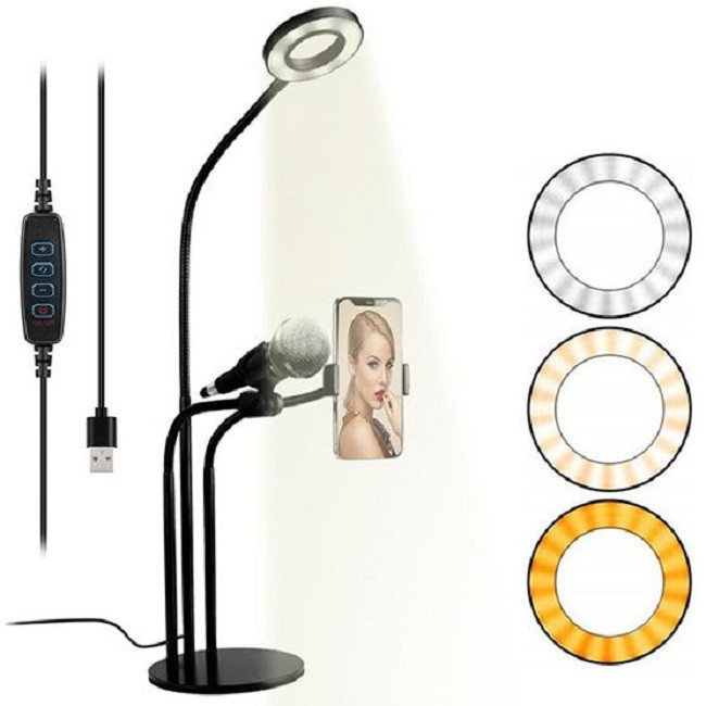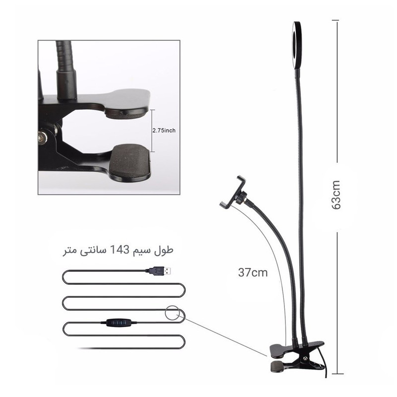 رینگ لایت همان وسیله استثنایی است که به شما امکان می دهد بهترین فیلم ها و عکس های سلفی و یا ویدئوهای زنده برای شبکه های اجتماعی تهیه نمایید و لذت ببرید. این مدل شامل یک گیره برای اتصال به لبه میز و غیره، یک بازوی نگهدارنده گوشی و یک بازوی بلند متصل به رینگ لایت می باشد. رینگ لایت در واقع یک حلقه نور است که می تواند بهترین نور پردازی بدون سایه را بر روی چهره شما و یا غیره تابانده و علاوه بر آن حلقه بسیار زیبایی از نور را در چشمان شما ایجاد نماید تا چشمان و چهره ای زنده، با روح و بسیار زیبا داشته باشید. محصول حاضر نیروی خود را از طریق اتصال به درگاه یو اس بی کامپیوتر، شارژر و یا پاور بانک تامین می نماید و بر روی کابل یک کیت کنترل برای خاموش و روشن، تغییر رنگ نور با سه رنگ زرد، سفید روشن و سفید گرم و دکمه های کم و زیاد کردن شدت نور است تا یک محصول پرفکت و استثنایی در اختیار شما قرار دهد.
