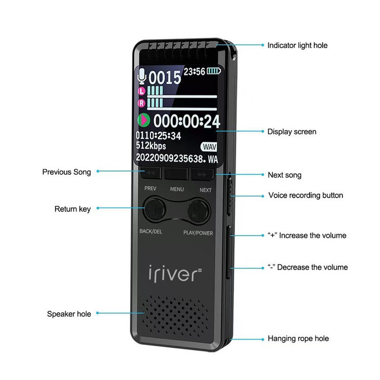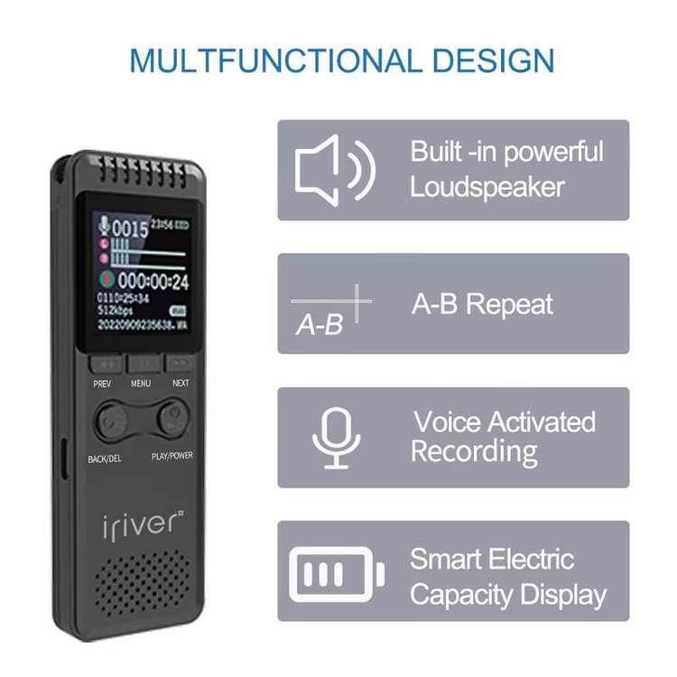 صفحه نمایش رنگی ، بدنه تمام فلز ، دوام شارژ100 ساعتی ، ضبط صدا با فرمت WAV وMP3 با کیفیت بالا ، سنسور هوشمند حساس به صدا ، سیستم حذف نویز محیط، پخش فایلهای حرفه ای صوتی از قبل FLAC , OGG ، قابلیت تغییر فولدر از روی دستگاه