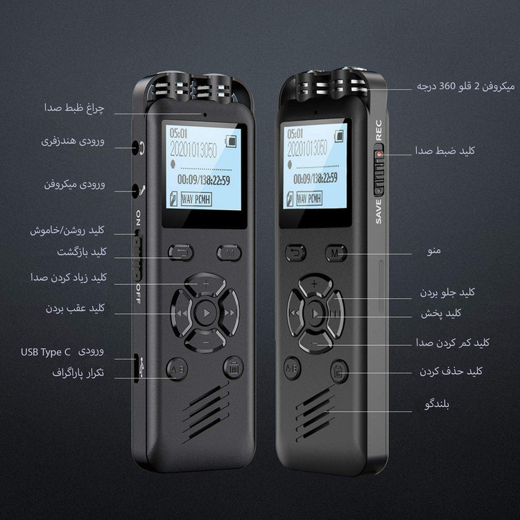 دوام شارژ 30 ساعتی ، ضبط صدا با فرمت WAV و کیفیت بالا ، سنسور هوشمند حساس به صدا ، سیستم حذف نویز محیط،قابلیت افزایش مموری تا 128گیگابایت،قالیت رمزگذاری