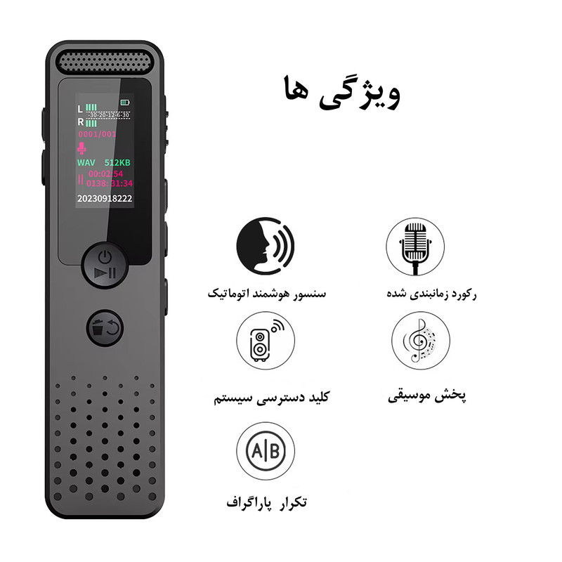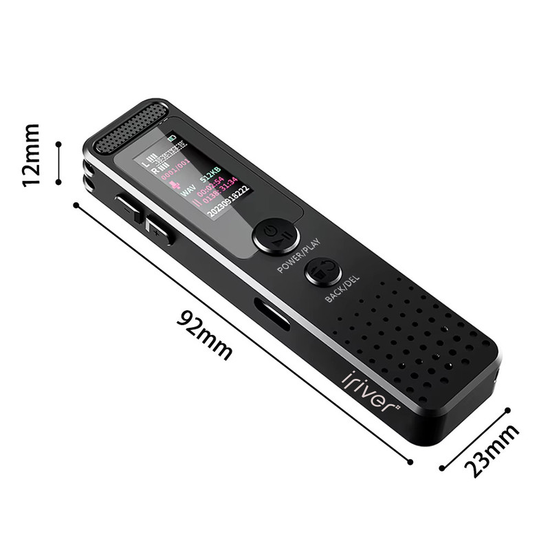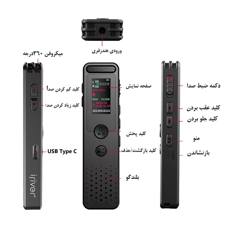 دستگاه ضبط کننده صدا آیریور مدل V69-64GB بهترین مدل ضبط کننده حرفه ای صدا با قیمت مناسب میباشد . ابعاد بسیار جمعوجور، وزن سبک تنها 50 گرم، حافظه داخلی با حجم 64 گیگابایت و ال سی دی رنگی، این دستگاه را از دیگر رقبا متمایز کرده است. چیپست بسیار کممصرف و همچنین باتری پر قدرت لیتیوم یونی نسل جدید ضبط صدا و پخش موسیقی (با هندز فری) تا 50 ساعت بهصورت مداوم میسر میسازد. دو عدد میکروفن استریو داخلی این دستگاه ضبط صدای استریو 360 درجهای با فرمت 1536KB/S WAV (باکیفیتترین حالت ضبط صدا حال حاضر) و فشرده MP3 باکیفیت بسیار عالی را فراهم میسازد. تکنولوژی هوشمند حذف نویز محیط (AGC) صدایی صاف، شفاف و بدون نویز حتی در محیطهای شلوغ را ممکن میکند. همچنین برای راحتی دسترسی و یافتن صداهای ضبط شده تمامی فایلها با برچسب تاریخ و ساعت ذخیره میشوند. کیفیت ضبط صدا در این مدل بنا به نیاز مصرف کننده دارای 7 حالت مختلف میباشد که در حالت WAV سمپل فرکانس ضبط صدا برابر با 1536 KB/S میباشد که در نوع خود بی نظیر است ، در صورت فعال سازی سیستم هوشمند سنسور حساس به صدا (AVR ) دستگاه فقط در زمان بودن صدا ، صدا را ضبط میکند که حساسیت این سنسور در منو قابل تنظیم میباشد. رکورد زمانبندی شده (TIME RECORDING)قابلیت شروع به ضبط صدا و خاتمه در تاریخ و ساعت معین را فراهم میسازد.اسپیکر داخلی ، تنظیم پسورد ( قفل کردن دستگاه با رمز ) از دیگر امکانات این رکوردر میباشد.در حالت پخش نیز این دستگاه دارای امکاناتی از قبیل اکولایزرهای مختلف ، حالتهای متنوع تکرار ، تکرار پاراگراف (A-B REPEAT ) و تنظیم سرعت پخش میباشد ، بوسیله در گاه یو اس بی تایپ سی USB TYPE-C به راحتی به کامپیوتر و گوشیهای موبایل با پشتیبانی OTG متصل شده و انتقال فایلهای ذخیره شده و یا موسیقی به حافظه داخلی را میسر میسازد همچنین میتوان این دستگاه را از طریق کلیه شارژرهای موبایل و درگاههای USB این دستگاه را شارژ نمود .بدنه این رکوردر فلزی و از آلیاژ آلمونیوم میباشد که سختی و دوام دستگاه را دوچندان میکند .در کل این دستگاه یک وسیله عالی کمک اموزشی با امکاناتی کامل و کیفیتی اصیل میباشد.