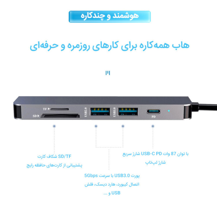 هاب 6 پورت USB-C ماکار مدل MK-HDMI یک ابزار چندمنظوره و کاربردی است که به کاربران امکان میدهد دستگاههای مختلف خود را به راحتی به هم متصل کرده و از قابلیتهای گسترده آن بهرهمند شوند. این هاب با طراحی باریک و جمعوجور خود به راحتی قابل حمل است و برای استفاده در محیطهای کاری، منزل یا سفر کاملاً مناسب است. پورت HDMI این دستگاه از وضوح 4K با نرخ انتقال 30 هرتز پشتیبانی میکند و به شما اجازه میدهد ویدئوها و تصاویر را با کیفیت بالا روی مانیتور یا تلویزیون خود مشاهده کنید. همچنین، پورت USB 3.0 تعبیه شده در این هاب امکان انتقال دادهها را با سرعتی تا 5 گیگابیت بر ثانیه فراهم میکند که مناسب برای انتقال فایلهای حجیم در کمترین زمان ممکن است. بدنه این هاب از آلیاژ آلومینیوم ساخته شده است که علاوه بر طراحی زیبا و مقاوم در برابر خط و خش، خاصیت خنککنندگی بالایی نیز دارد. این ویژگی مانع گرم شدن دستگاه در زمان استفاده طولانی میشود. علاوه بر این، این هاب از پروتکل شارژ سریع PD 3.0 پشتیبانی میکند و میتواند با توان حداکثر 87 وات دستگاههای شما را شارژ کند. یکی از نقاط قوت این محصول، سازگاری گسترده آن با انواع دستگاهها از جمله لپتاپها، گوشیهای هوشمند، تبلتها و سیستمعاملهای مختلف مانند ویندوز، مک، اندروید و iOS است. وجود پورت USB 2.0 و اسلاتهای کارت حافظه SD و TF نیز امکانات بیشتری را برای کاربران فراهم میکند، هرچند امکان خواندن همزمان هر دو کارت وجود ندارد. این هاب با ابعاد کوچک و وزن سبک خود به راحتی در کیف شما جا میشود و برای کسانی که نیاز به استفاده همزمان از چندین دستگاه دارند، انتخابی ایدهآل محسوب میشود. با استفاده از این هاب دیگر نگران محدودیت پورت در لپتاپهای جدید نخواهید بود و میتوانید تمامی نیازهای دیجیتالی خود را به راحتی برطرف کنید. این محصول با طراحی حرفهای و عملکرد بینظیر خود، گزینهای عالی برای کاربران حرفهای و عادی است.این هاب به صورت Plug and Play عمل میکند و نیاز به نصب درایور خاصی ندارد. هاب MAKAR با استفاده از تراشه هوشمند داخلی خود، از کارکرد بدون تأخیر و تداخل پورتها پشتیبانی میکند و از بروز جریان بیش از حد، ولتاژ بیش از حد و دمای بالا جلوگیری میکند. علاوه بر این،هاب ماکار دارای نشانگر LED می باشد که در هنگام آماده به کار روشن می شود.