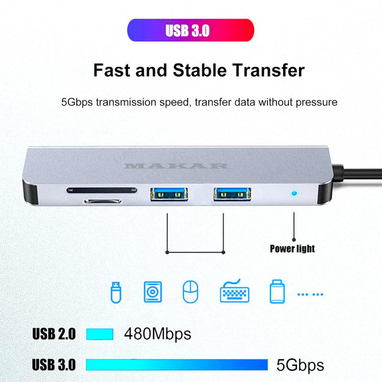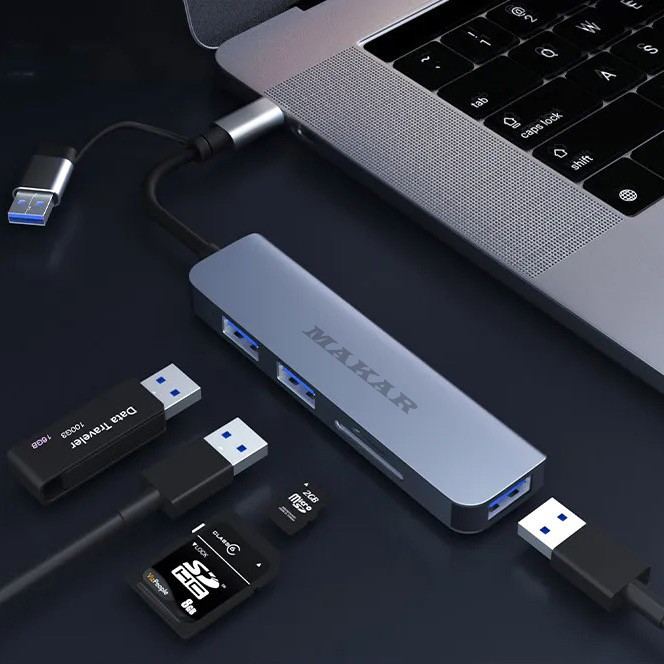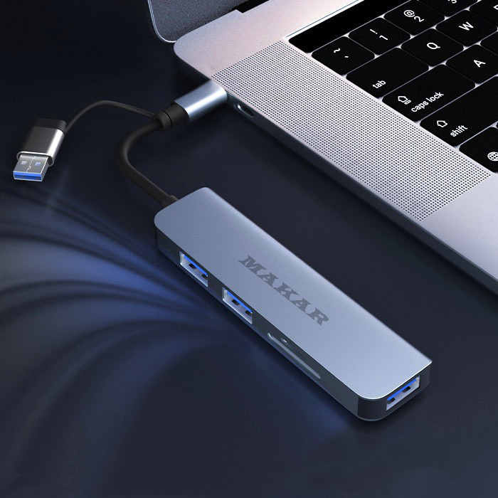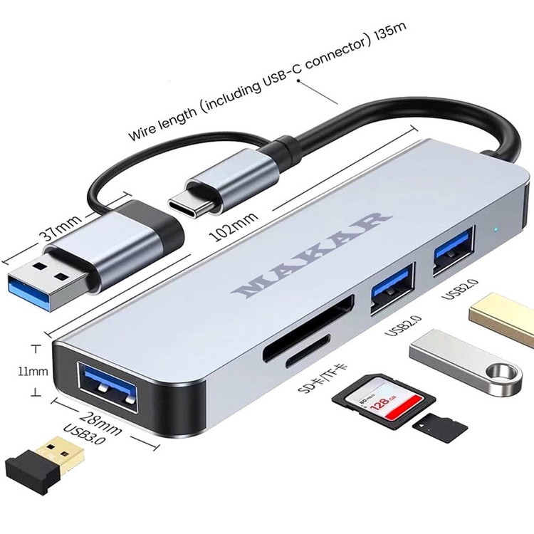 هاب و کارت خوان 5 پورت USB 3.0 ماکار مدل 5in1 MK-HU235 از برند MAKAR، یک هاب USB3.0 با طراحی دو سر (USB و Type-c) و پنج پورت است که گزینههای ارتباطی شما را در رایانه یا موبایل به صورت قابل توجهی افزایش میدهد. این هاب با استفاده از مواد با کیفیت بالا از جمله آلیاژ آلومینیوم و ABS ساخته شده است که تضمین میکند دوام و استحکام کافی را دارد. این هاب دارای یک پورت USB 3.0، دو پورت USB 2.0 و همچنین شکافهای کارت SD و TF میباشد که انتقال دادهها و دسترسی به چندین دستگاه را به طور همزمان امکانپذیر میکند. علاوه بر این، یکی از ویژگیهای برجسته این محصول امکان استفاده به عنوان ایستگاه شارژ میباشد. پورت USB 3.0 سرعت انتقال دادهها را تا 5 گیگابیت بر ثانیه ارائه میدهد که انتقال سریع اطلاعات را تضمین میکند. علاوه بر این، دو پورت USB 2.0 نیز از تجهیزات جانبی USB مختلفی مانند فلش دیسک، کیبورد و موس پشتیبانی میکنند. این هاب همچنین به عنوان یک رم ریدر (کارتخوان) عمل میکند که دسترسی سریع و آسان به فایلها و دادههای موجود در کارتهای حافظه را فراهم میسازد. آلیاژ آلومینیومی هاب 5in1 HUB&CardReader مقاوم در برابر حرارت و ضد اثر انگشت است و دارای قابلیتهای خنککنندگی مناسبی میباشد که طول عمر طولانی هاب را تضمین میکند. هاب MAKAR با استفاده از تراشه هوشمند داخلی خود، از کارکرد بدون تأخیر و تداخل پورتها پشتیبانی میکند و از بروز جریان بیش از حد، ولتاژ بیش از حد و دمای بالا جلوگیری میکند تا ایمنی دستگاهها تضمین شود. علاوه بر این، هاب ماکار دارای نشانگر LED می باشد که در هنگام آماده به کار روشن می شود. این هاب به صورت Plug and Play عمل میکند و نیاز به نصب درایور خاصی ندارد، که استفاده از آن را سریع و آسان میسازد. در مجموع، هاب 5in1 HUB&CardReader مدل MAKAR یک ابزار بسیار کارآمد و کاربردی است که با قابلیتهای متنوع و طراحی مقاوم خود، گزینهای عالی برای گسترش پورتهای دستگاههای الکترونیکی شما محسوب میشود. با این هاب میتوانید به راحتی و با سرعت بالا اطلاعات خود را منتقل کنید، چندین دستگاه را به طور همزمان به سیستم خود متصل کنید و از امکانات گستردهای که فراهم میکند بهرهمند شوید.